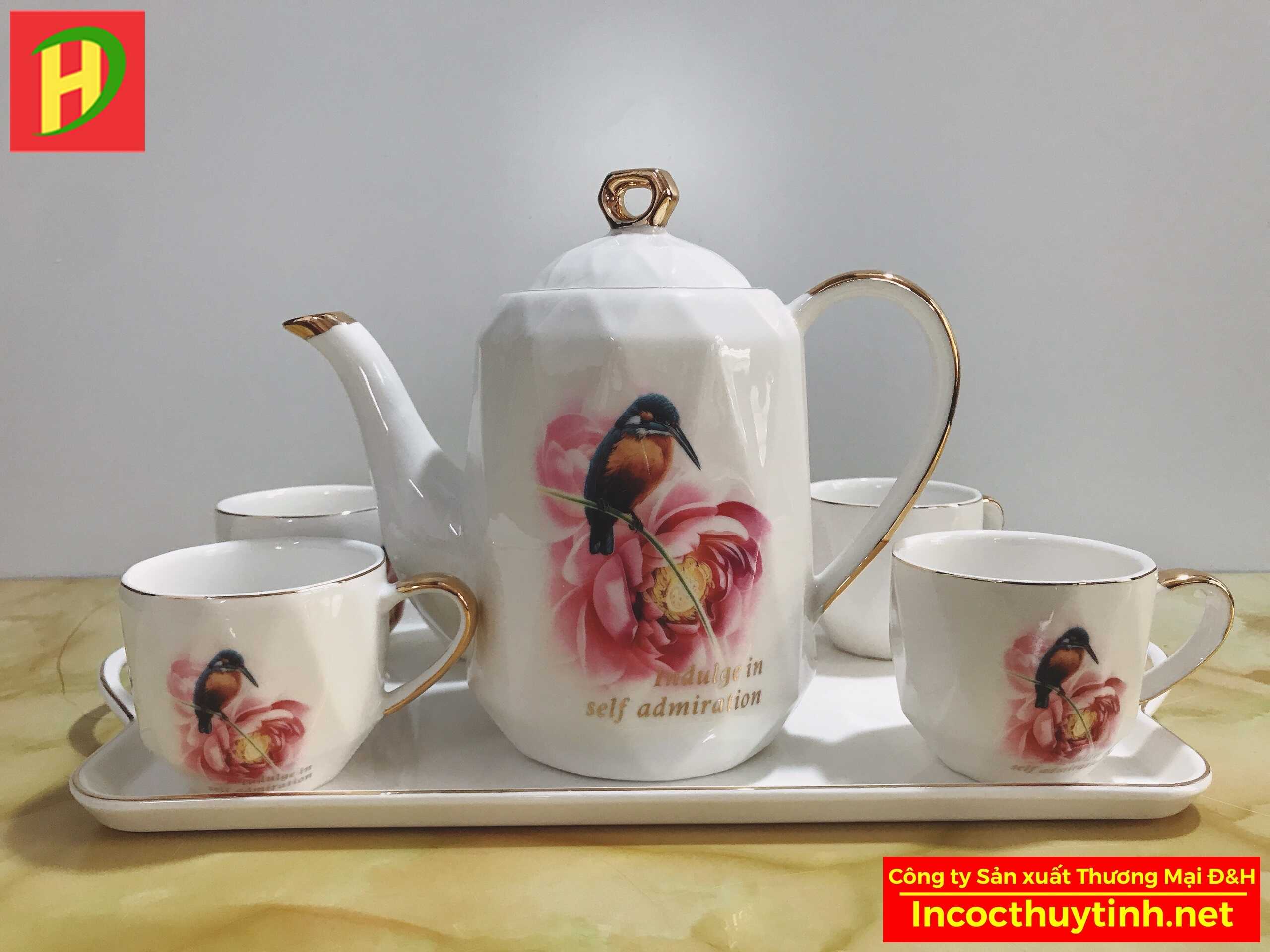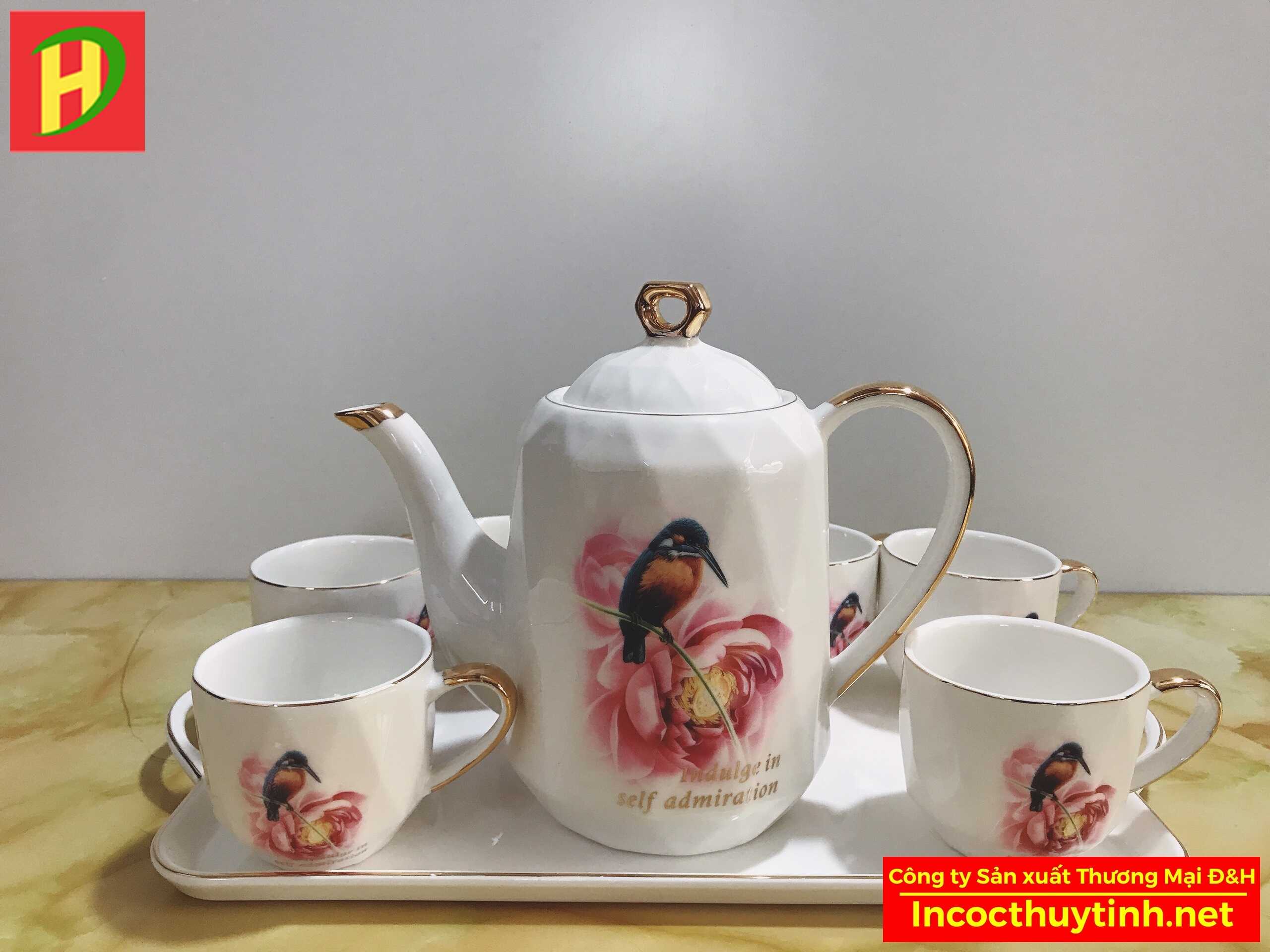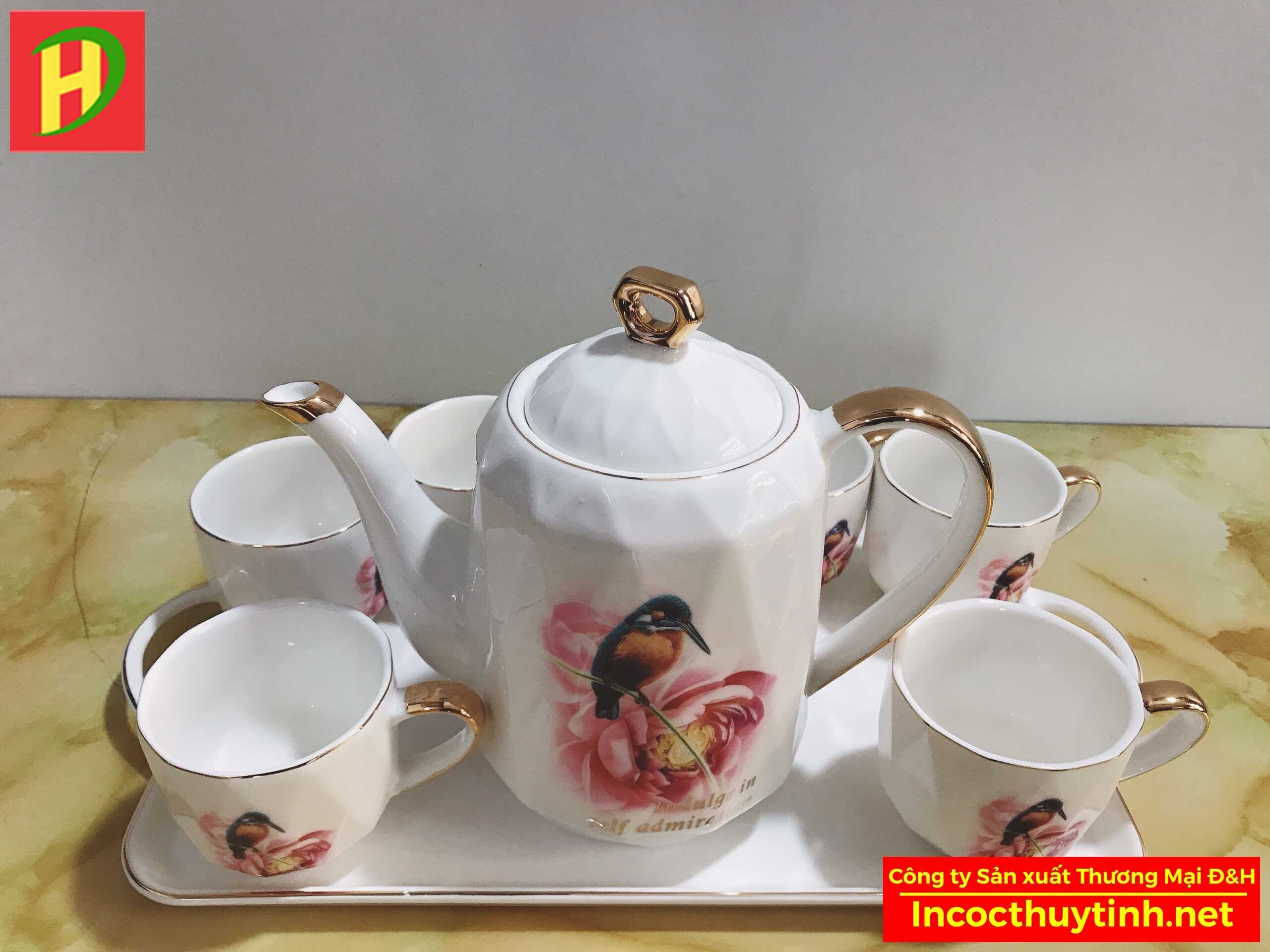 Bộ ấm chén sứ hình chú chim với họa tiết mạ vàng có chất liệu gốm sứ cao cấp, bên ngoài được phủ một lớp men thủy tinh đặc trưng với công nghệ hiện đại, nước men thủy tinh sử dụng thời gian dài không gây trầy xước của Công ty sản xuất thương mại D&H, hãy cùng tìm hiểu thêm về sản phẩm quý phái này nhé!