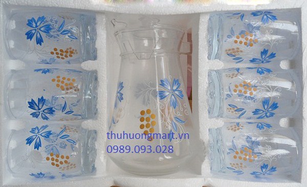 Được thiết kế với chất liệu là thủy tinh, trong vừa sạch sẽ, vừa sang trọng. Bên cạnh đó trên chiếc bình và những chiếc ly được khắc vẽ những hoa văn cùng với màu sắc khá sặc sỡ, vừa trong phá cách mà lại vừa trang nhã.