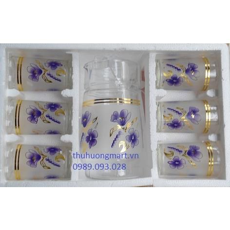 Đây là bộ bình có mã số B04. Bộ bình gồm một bình lớn đi kèm 6 chiếc cốc đều làm bằng chất liệu thủy tinh dày dặn, bao phủ bởi một lớp nhám mờ cùng hoạ tiết hoa xanh lam đi tông những chiếc lá mạ vàng óng ánh. Bộ Bình nước B04 có hoa văn giản dị, nhẹ nhàng, chính vì thế phù hợp với thị hiếu nhiều người, là một sự lựa chọn an toàn.