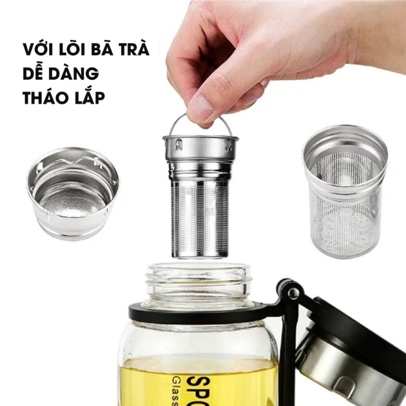 Nắp nhựa bọc kim loại vặn rất chắc và an toàn, không rỉ nước, có thể lọc bã trà,...