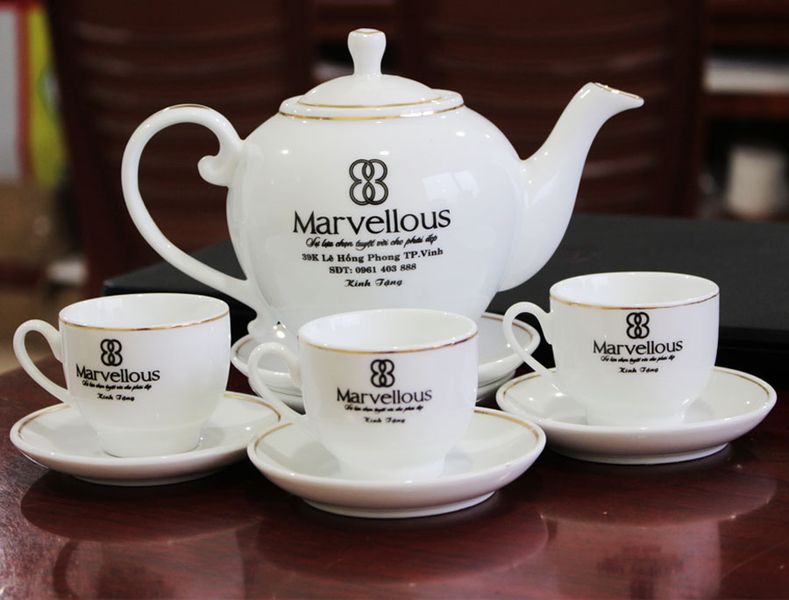In ấn logo thương hiệu lên bộ ấm chén sứ