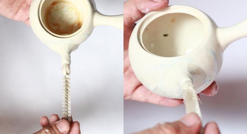 - Dùng cọ dài để len lỏi vào các ngóc ngách bên trong ấm dễ dàng, cọ rửa triệt để.Nếu bạn không có cọ dài, bạn có thể quấn vải mềm vào que mảnh (ví dụ sợi kém nhỏ) để cọ trong vòi